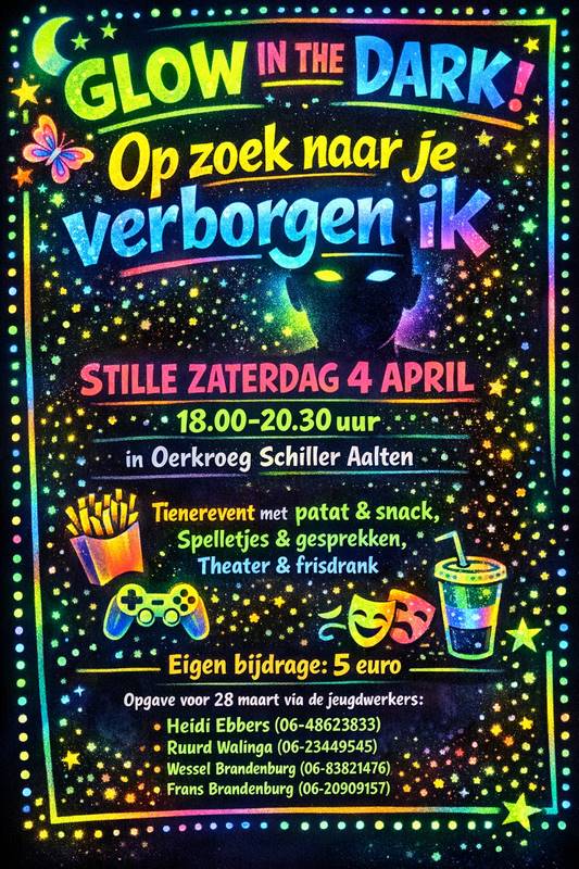 ‘Glow in the dark’ is een initiatief van de kerkelijk werkers van PG Aalten, Dinxperlo, Varsseveld en Halle. Opgave is nodig vanwege de catering. Dat kan tot en met zaterdag 28 maart bij de kerkelijk werkers van de desbetreffende organiserende gemeenten: