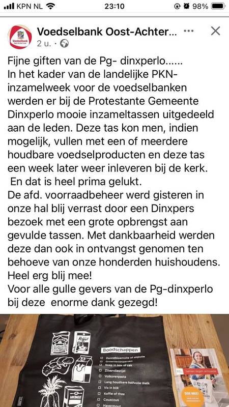 De dinsdag erop heeft Sylvia Vogelpoel de tassen en dozen naar de Voedselbank gebracht en ze waren er daar heel blij mee, zie het bijgevoegde artikeltje dat ze op hun facebookpagina hebben geplaatst.